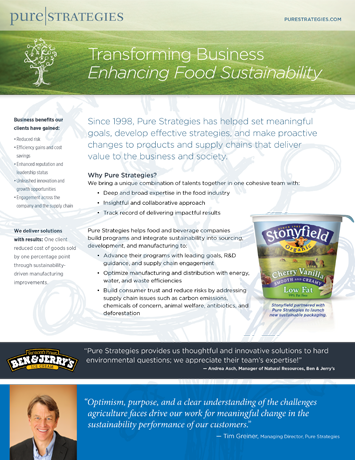 Pure Strategies has a track record of assisting food and beverage companies build goals and strategies, gain efficiencies, and engage supply chains to address risks such as animal welfare, antibiotics and deforestation.