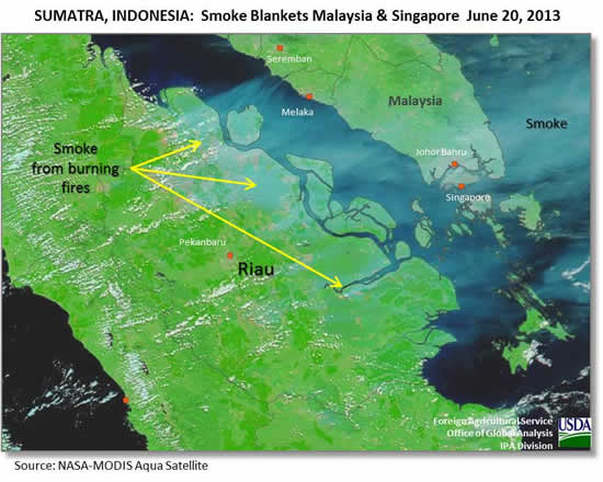 In June 2013, air pollution levels in Malaysia and Singapore reached record highs, closing businesses. The cause? Thousands of fires set by both plantation managers and small farmers in neighboring Indonesia to clear land to plant oil palm trees (see map).