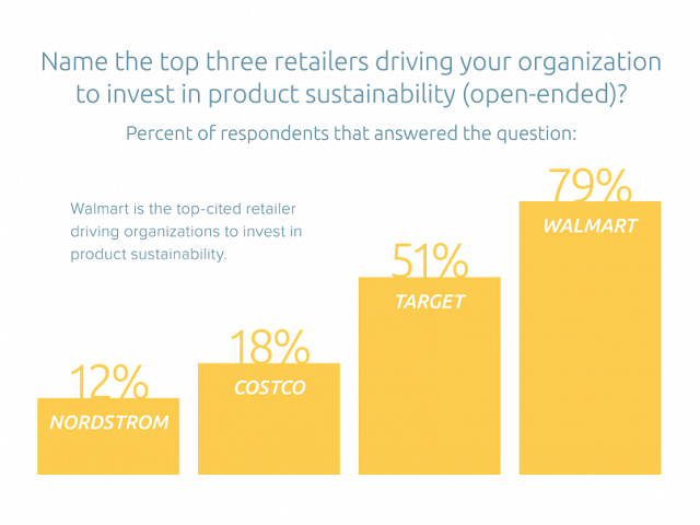 Pure Strategies’ research revealed that more than three-quarters of the 100 global companies we surveyed cited Walmart as the retailer responsible for pushing them to improve the sustainability of their products, followed by Target and Costco.