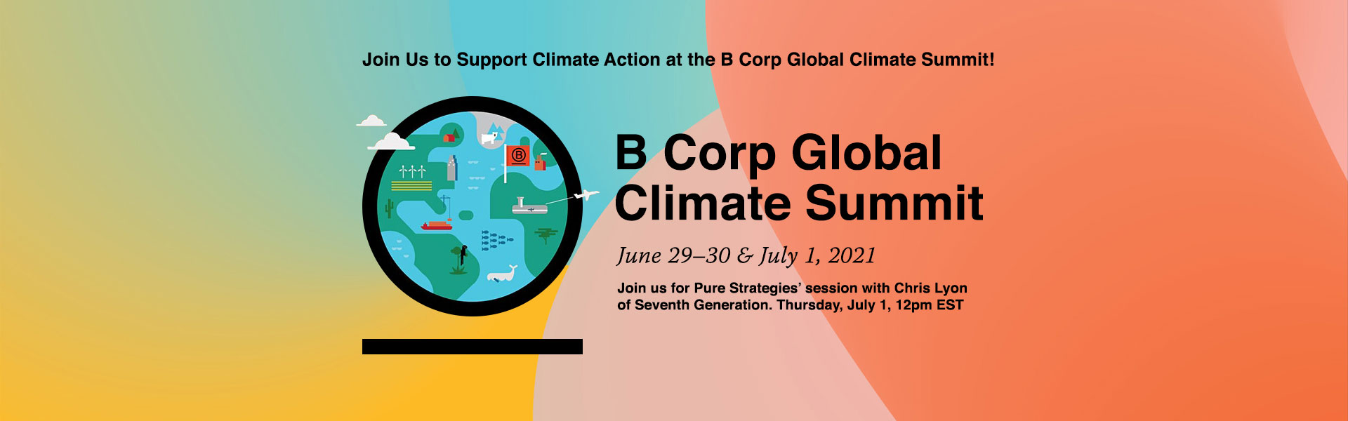 Pure Strategies sponsored the B Corp Global Climate Summit, June 29 to July 1, 2021. The free event featured 2000 global climate leaders from around the world, working to advance a just, regenerative, zero carbon future. During the summit, Pure Strategies hosted an interactive session with Seventh Generation on Thursday, July 1st to explore identifying and mitigating greenhouse gas hotspots in the company's supply chain.